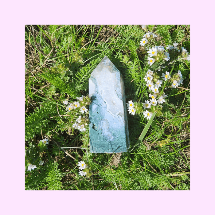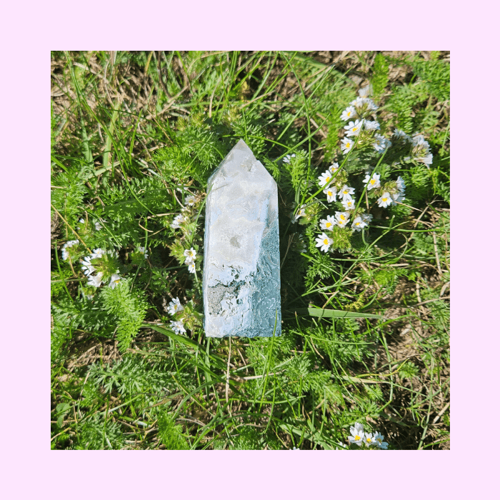 This palm-sized tower is perfect for all! It will bring good energy into your home and help your succulents and other plants flourish! It has many beautiful quartz inclusions and druzy pockets! Breathtaking.