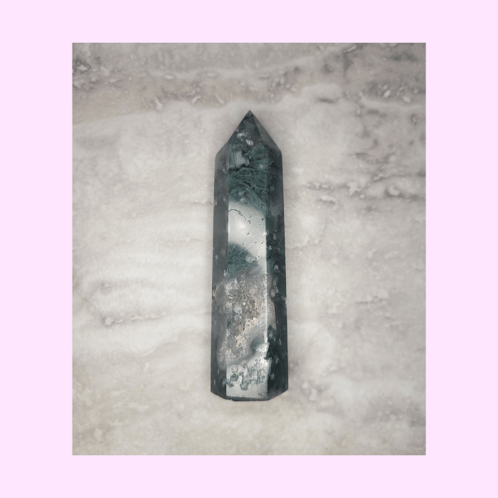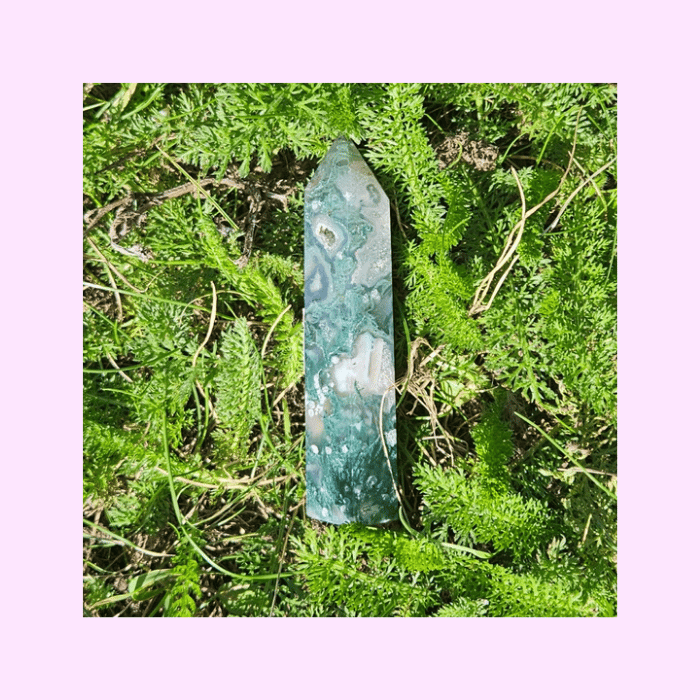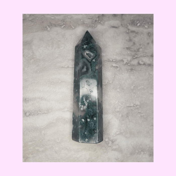 This moss agate tower is affordable, beautiful, and carries many spiritual properties!